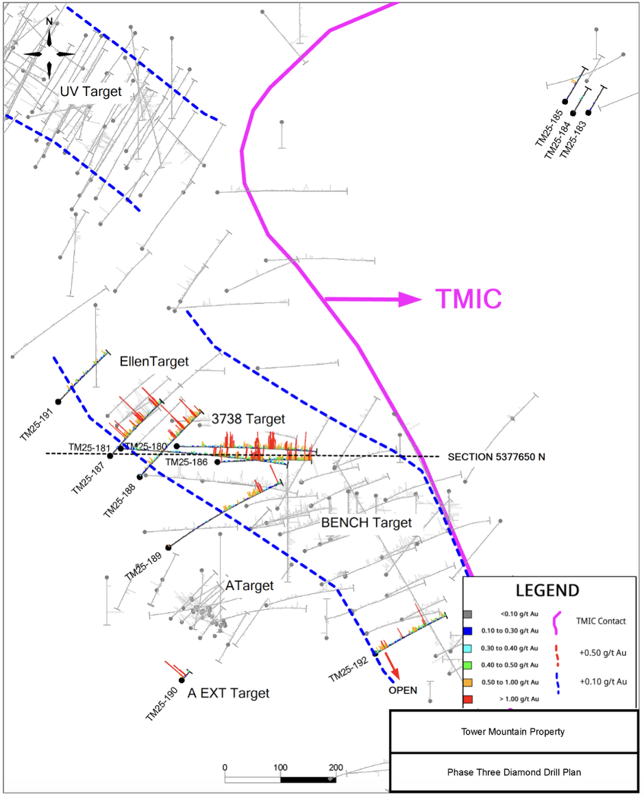 Overall, Phase Three successfully demonstrated ample opportunities to increase the mineralization footprint exist within the historical drill pattern as postulated. Drilling around the perimeter of the TMIC is fully permitted through 2028. The western contact area is immediately accessible and offers over 40,000 metres of drilling soon to be quantified in a current, independent, Mineral Resource Estimate. At current gold prices, the Company considers the west contact, consisting of the UV, Bench, Ellen, A and 3738 Targets, to be a compelling exploration target that offers opportunity for rapid resource growth. This, combined with the unmatched access to fully built, publicly maintained infrastructure, allows for more rapid project advancement than many other large-tonnage, low-grade projects.