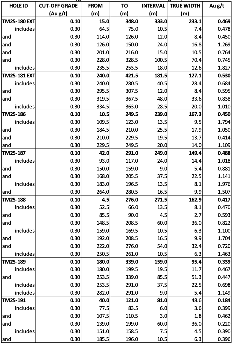 Table 1.0 summarizes the results of the 3738 drill holes. The Table includes the previously reported portions of holes TM25-180 and TM25-181, from 0 to 252.0 metres. The extension of both holes intersected significant mineralization producing results that vary from the those reported for the Phase Two drill program.