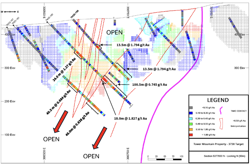 At the 3738-Target, drilling expanded the mineralized footprint with all seven (7) holes returning significant intercepts. Standout results include: 1.83 g/t Au over 18.0 metres within 0.47 g/t Au over 333.0 metres (TM25-180 extension), 0.53 g/t Au over 181.5 metres (TM25-181 extension), 1.05 g/t Au over 25.5 metres (TM25-186), 1.98 g/t Au over 13.5 metres (TM25-187), 0.42 g/t over 271.5 metres (TM25-188), 0.698 g/t Au over 37.5 metres (TM25-189)