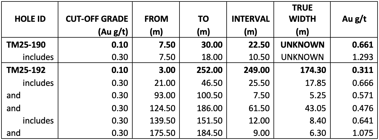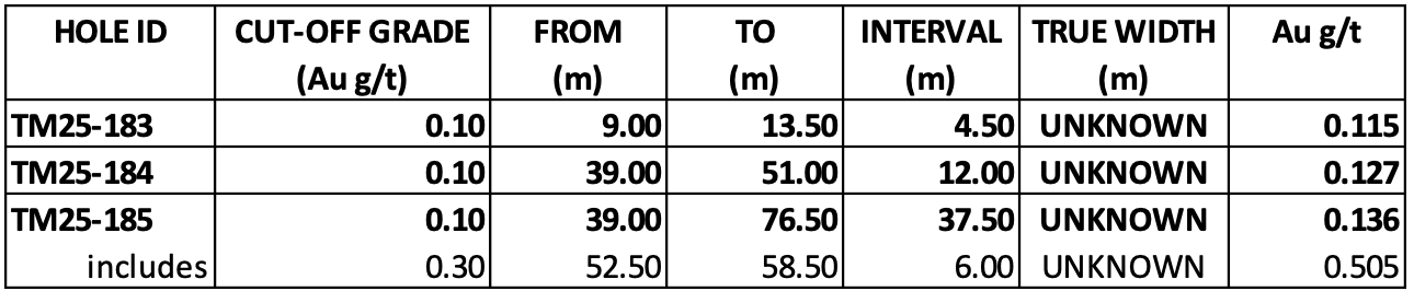 Three (3) holes, (249 metres) were completed at the H-Target, 25 metres east, west and below hole TM25-182 (Phase Two) that intersected 0.73 g/t Au over 6.0 metres. All three holes intersected mineralization above a 0.10 g/t Au cut-off grade. TM25-185, 25 metres northwest of TM25-182, intersected 0.505 g/t Au over 6.00 metres suggesting a relative flat lying target.