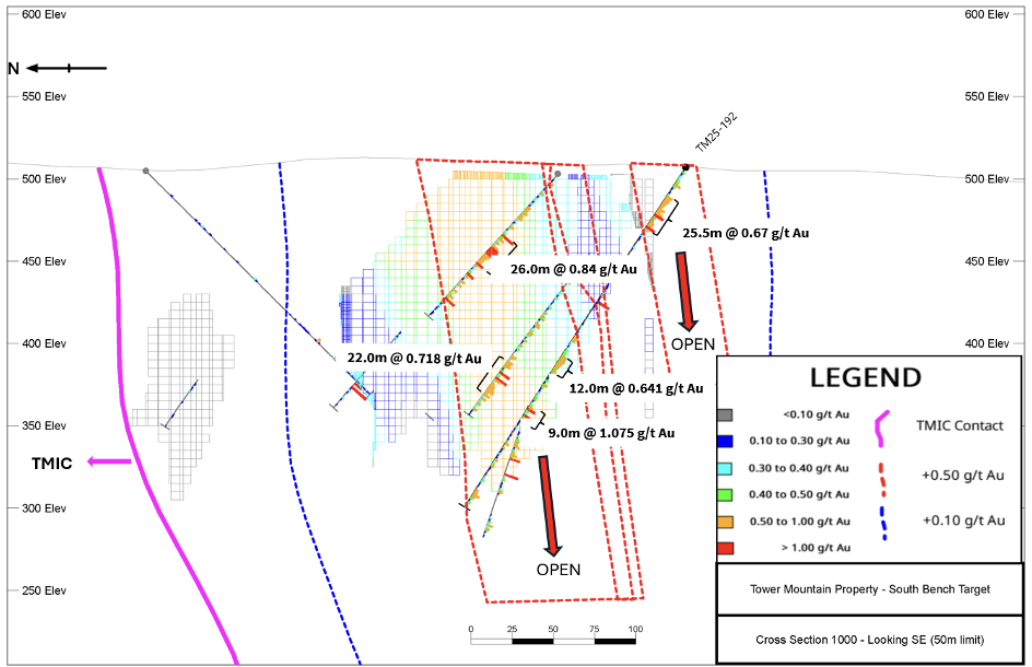 TM25-192, the final hole of Phase Three, was drilled at the south end of the Bench Target, approximately 25 metres south and 50 metres below hole TM11-82 (0.718 g/t Au over 22.0 metres), targeting another gap in the Company’s exploration model. TM25-192 intersected 0.641 g/t Au over 12.0 metres vertically below the TM11-82 intersection. It also intersected 0.666 g/t Au over 25.5 metres near surface, a previously unrecognized zone of mineralization that is open to the southeast and down-dip. (Reference Figures 1.0 & 3.0).