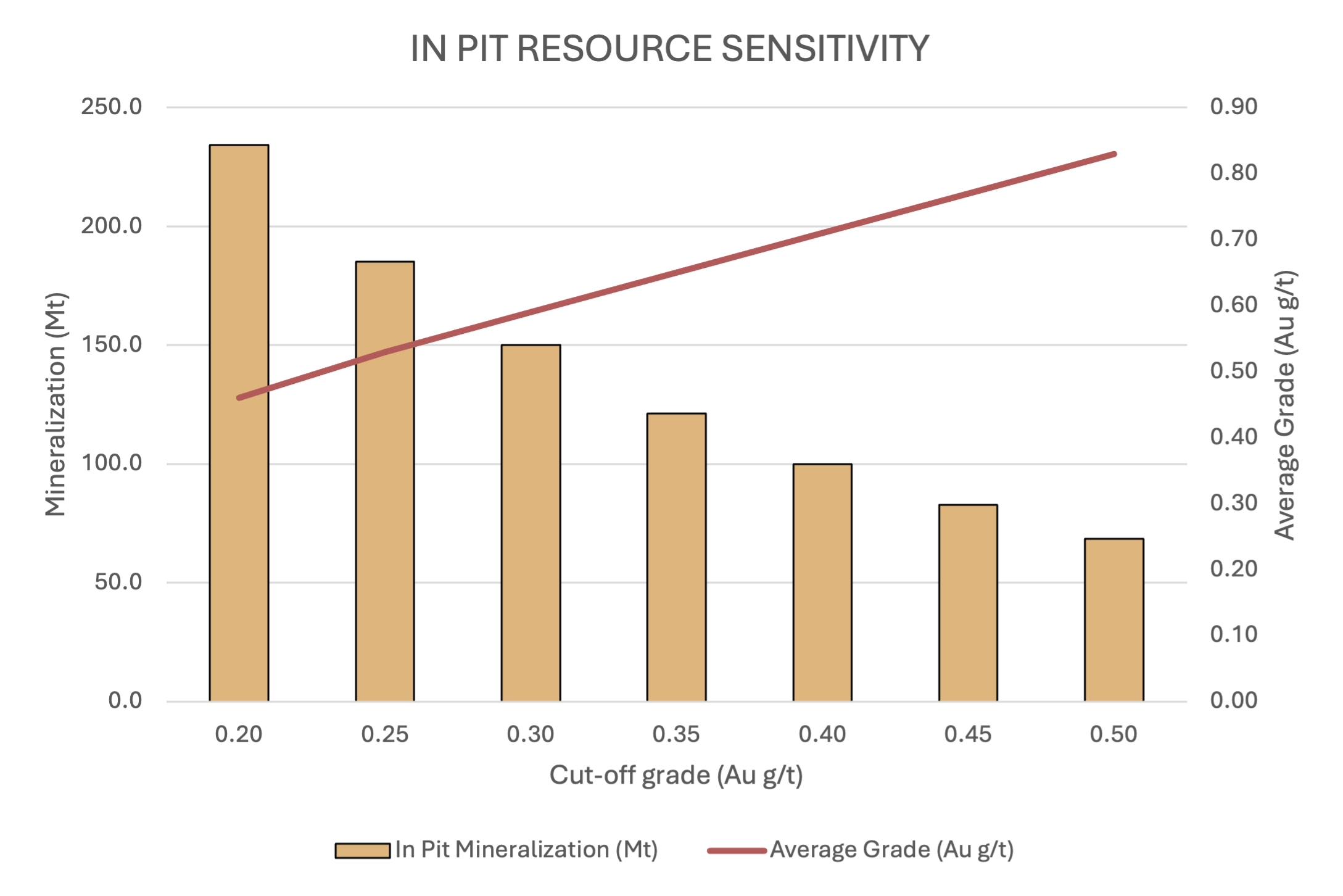 There are opportunities to enhance the average grade of the resource within the current optimized pit shell as demonstrated by sensitivity analysis at various cut-off grades.