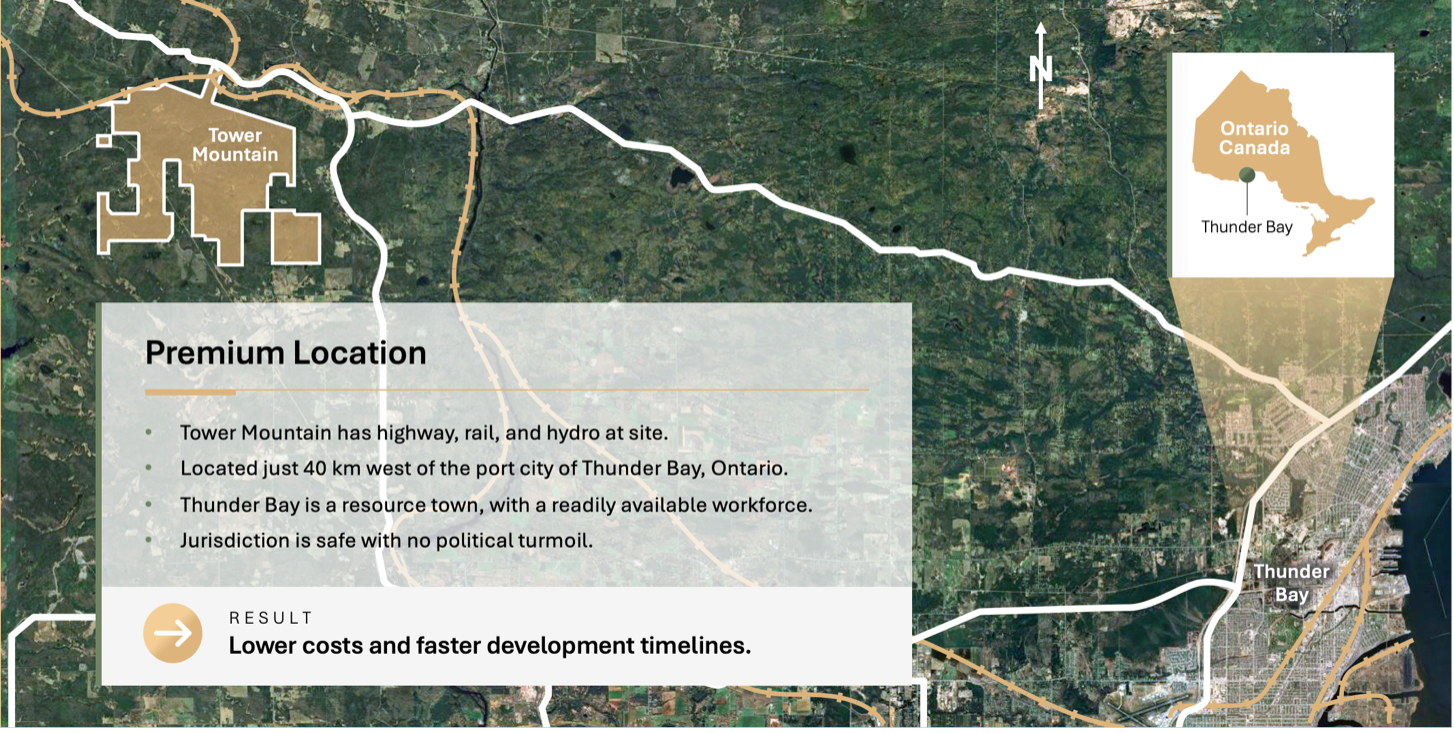 Tower Mountain is located adjacent to the Trans-Canada highway, approximately 40 km west of the international port city of Thunder Bay, Ontario (pop. 110,000).