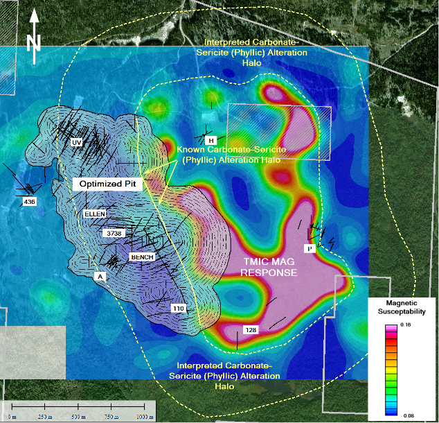 CSC alteration ranges from weak to intense resulting in magnetite destruction and widespread, disseminated pyrite and gold. The magnetite destruction is immediately highlighted by magnetic imagery as broad, intense magnetic lows where alteration is most intense. Magnetic lows surround the TMIC offering a compelling, long-term exploration opportunity to increase the mineral resource of the Property.